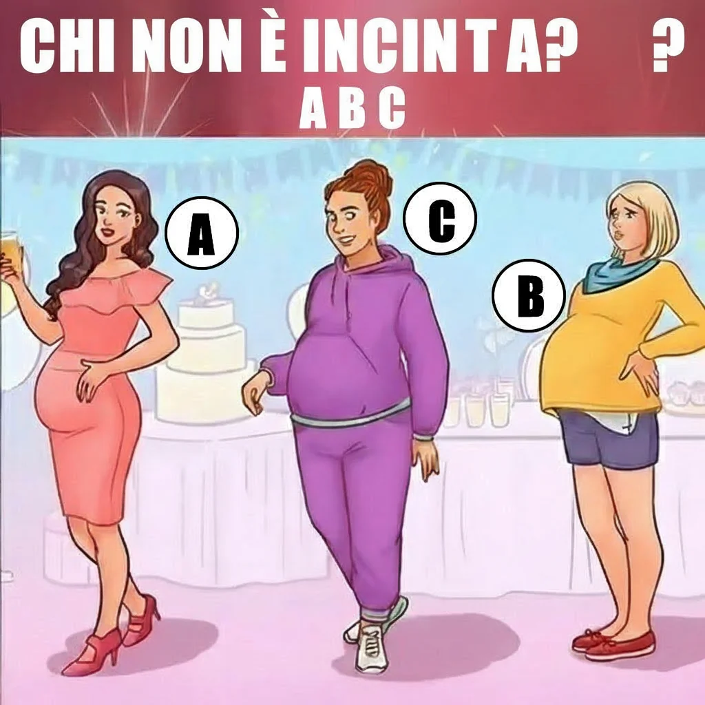 Tre giovani donne appaiono con silhouette molto simili e un dettaglio che cambia completamente l'interpretazione della scena. La domanda è diretta: quale di loro non è incinta?